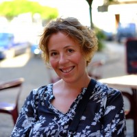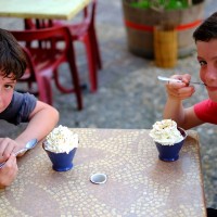 kate and the kids in a shady cafe